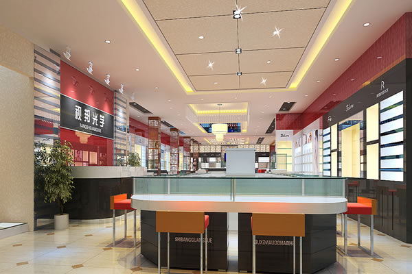 大廳是展現(xiàn)給客人最基本最實在的部分,各種眼鏡樣品都在這里展示給顧客,因此此處的精品裝修非常重要,也是提升一個眼鏡店身價的保障。大廳對于照明、色彩、鏡子的運(yùn)用顯得相當(dāng)重要,一般眼鏡店都使用白光照明,以透出眼鏡的質(zhì)感,光亮的感覺也能體現(xiàn)出一種更舒適的購物氣氛。在色彩的搭配上,淺色眼鏡用深藍(lán)色襯托、深色眼鏡用白底來表現(xiàn),都更符合文化消費的情調(diào)也能感受眼鏡的色彩和材質(zhì)帶來的另類感。同時,鏡子的運(yùn)用也很重要,能給人店面寬敞的錯覺,起到亮堂、開闊視野的作用。